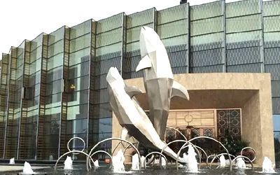 酒店不銹鋼雕塑以美為主,一般為裝飾性美陳景觀雕塑,常見于酒店大門、大堂、園林。包括但不限于水景景觀類,如圓環、噴泉、鏤空球;裝飾美陳類,如蓮花、翅膀、鵝卵石、水滴等。